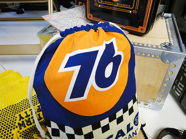 商品説明 アメリカの直線道路を車で走ってると出会いそうなモーターオイル、ユノカル76の看板がモチーフになったキンチャク袋です。